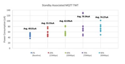 與測試 1 (DTIM10) 的結果相比,在無干擾信道場景下,目標喚醒時間功能使功耗降低了 45%。在接近飽和的場景下,SiWx917 啟用目標喚醒時間時的功耗僅為采用 DTIM10 時功耗的 1/3??傊?,采用目標喚醒時間的 SiWx917 能夠顯著延長物聯網設備的電池壽命,尤其是在網絡擁堵的情況下。