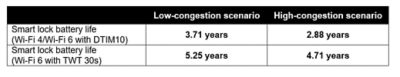 結果:Novus Labs 估算,SiWx917 能夠讓智能鎖擁有較長的電池壽命。在高擁塞場景下,延遲 1 秒、應用握手時間為 55 秒時,續航時間約為 3 年;而在低擁塞場景下,目標喚醒時間設為 30 秒時,續航時間甚至可達約 5 年。