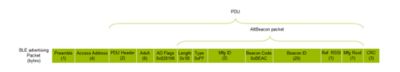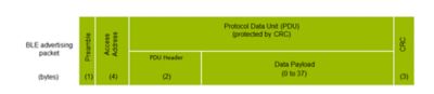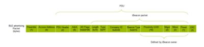 Both advertising packets and data packets use the same format, as shown in the figure below. Beacons follow the standard advertising packet format, but then format the embedded data payload to follow a pre-defined structure for the beacon pseudo-standard it uses. This allows the OS to treat a beacon’s advertising packet differently from other Bluetooth advertising packets.